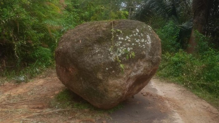 Butuh alat berat untuk menyingkirkan batu besar tersebut. Tak bisa disingkirkan warga karena bisa terguling ke kebun warga.