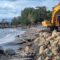 Senderan pantai sepanjang 780 meter yang baru dibangun akhir 2024 juga rusak. Paving blok terlepas dan berserakan ke jalan, sementara pondasi batu di sisi jogging track ikut roboh.