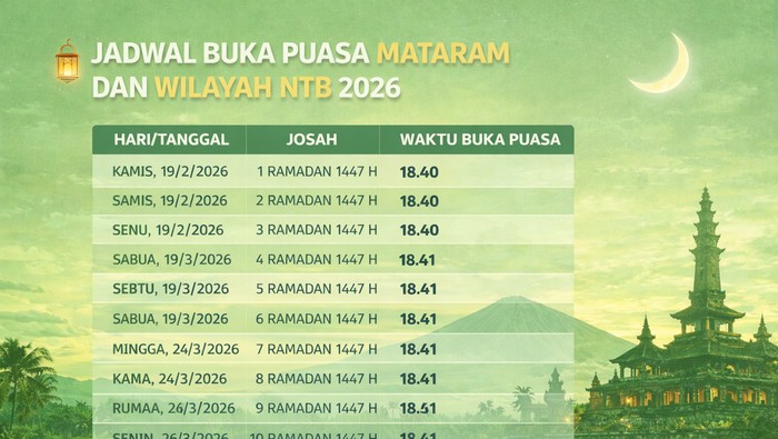 Untuk membantu masyarakat menjalankan ibadah dengan lebih teratur, berikut ini adalah jadwal buka puasa untuk Jumat, 20 Februari 2026/2 Ramadhan 1447 H untuk wilayah Mataram dan wilayah NTB.