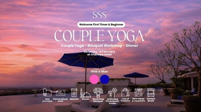 Special Valentine: Couple Yoga hadir sebagai konsep kencan yang lengkap dalam satu hari. Acara ini menggabungkan sesi yoga berdua, workshop bouquet, dan makan malam romantis dalam satu rangkaian kegiatan yang dirancang untuk mempererat bonding pasangan.