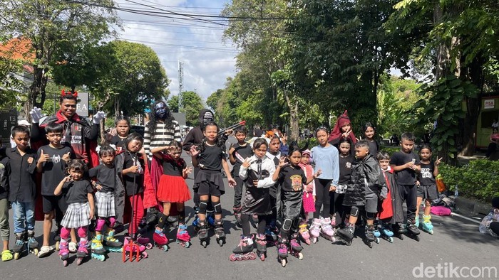 Suasana car free day (CFD) di Lapangan Niti Mandala Renon, Denpasar, Bali, pagi ini agak berbeda dari edisi sebelum-sebelumnya. Puluhan anak hingga orang dewasa tampak mengenakan kostum bertema horor sembari bermain sepatu roda.
