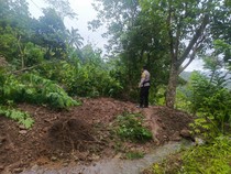Warga setempat sudah berusaha menyingkirkan material longsor tapi tak berhasil. Terdapat batu besar, material tembok yang roboh dan bambu yang menutupi badan jalan itu.