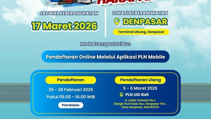 Mudik bersama 2026 ini menggunakan moda transportasi bus dan melayani keberangkatan dari beberapa kota, termasuk Kota Denpasar. Calon peserta yang akan mengikuti kegiatan mudik bersama 2026 ini harus memperhatikan syarat & ketentuan mudik bersama PLN. Yuk, simak penjelasan selengkapnya!