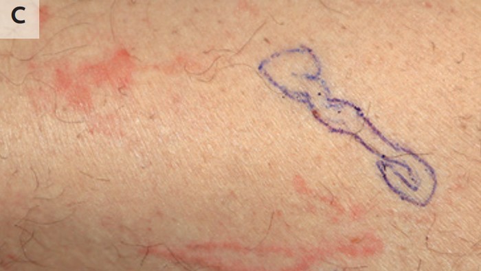 Awalnya, lesi tersebut muncul pertama kali di anus yang kemudian menyebar dengan cepat ke tubuh dan anggota gerak. Dokter menandai lesi itu dengan pena. Setelah 24 jam, lesi tersebut berpindah dari lokasi semula.