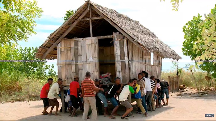 Kemudian, secara serentak mereka saling bahu-membahu untuk mengangkat rumah yang dipindahkan dari lokasi lama ke lokasi yang baru sesuai permintaan tuan rumah.